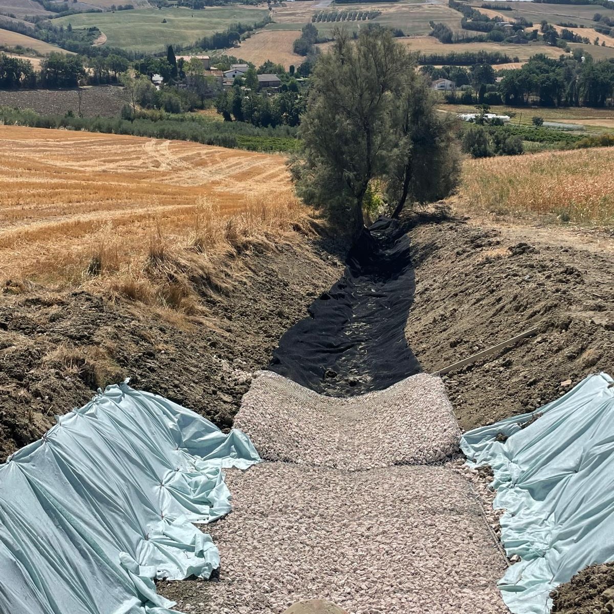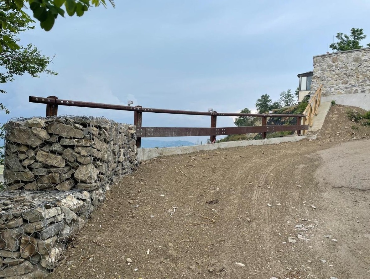 Messa in sicurezza dell’area mediante a realizzazione di due pozzi strutturali drenanti profondi almeno 14 metri dal piano che accoglie lo spazio sommitale , e sono realizzati con pali di piccolo diametro ( micropali diametro 300 mm ) profondi 26 metri che formano una paratia di pali chiusa.