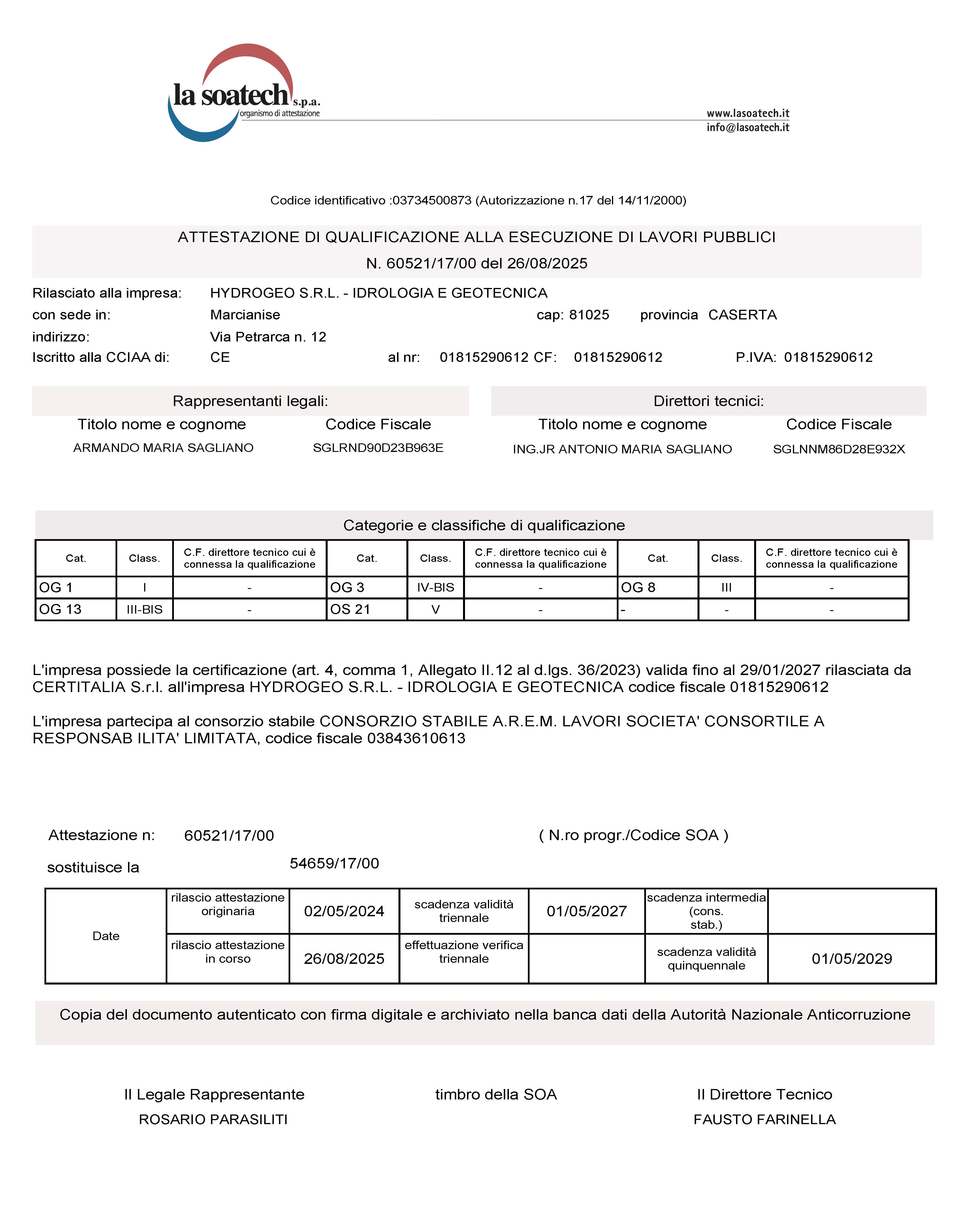 Qualificazione per l'esecuzione di lavori pubblici in diverse categorie e classifiche.