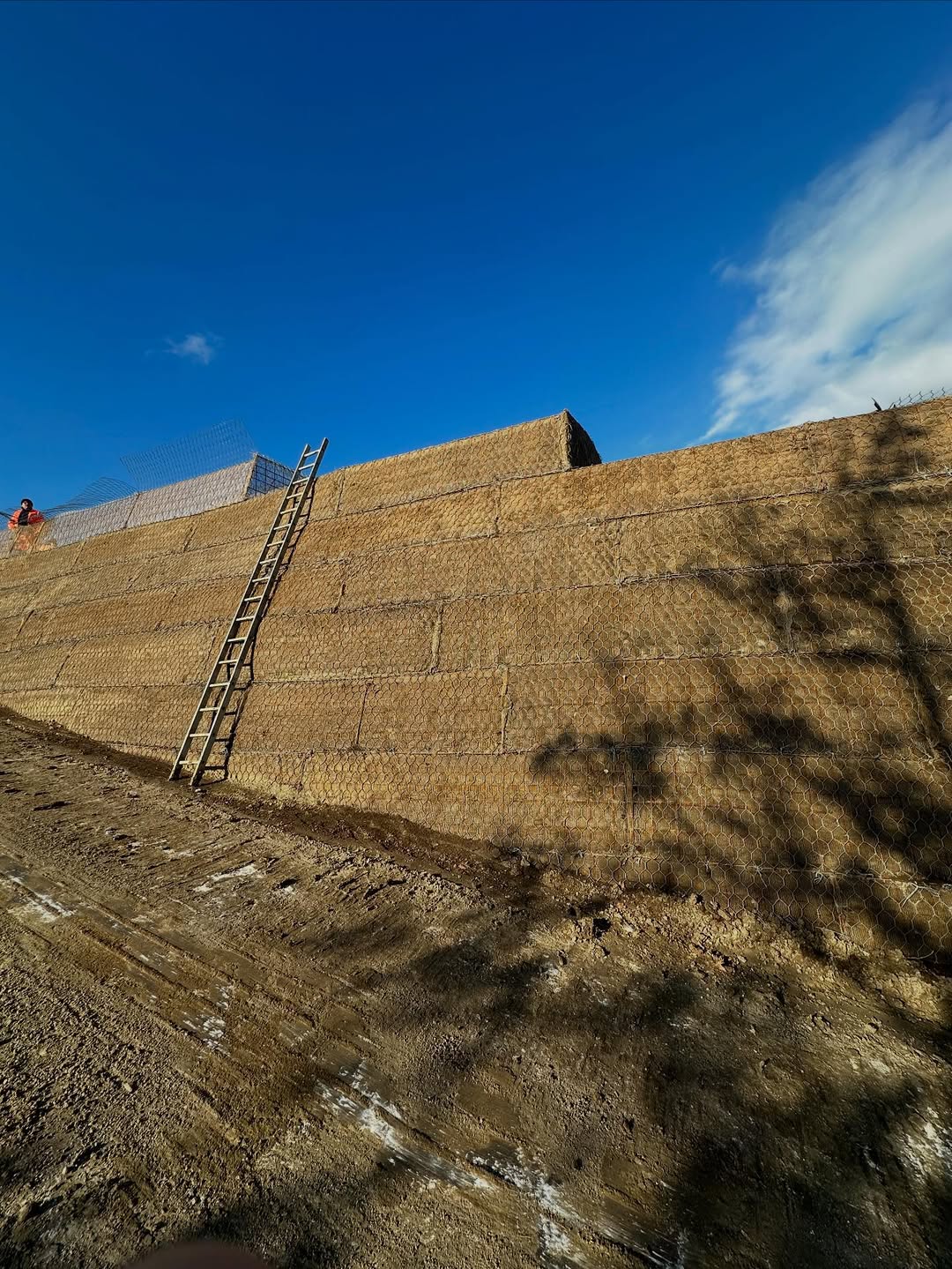 Realizzazione di scarpata in terre armate con posa di rete metallica e modellazione del rilevato in cantiere.